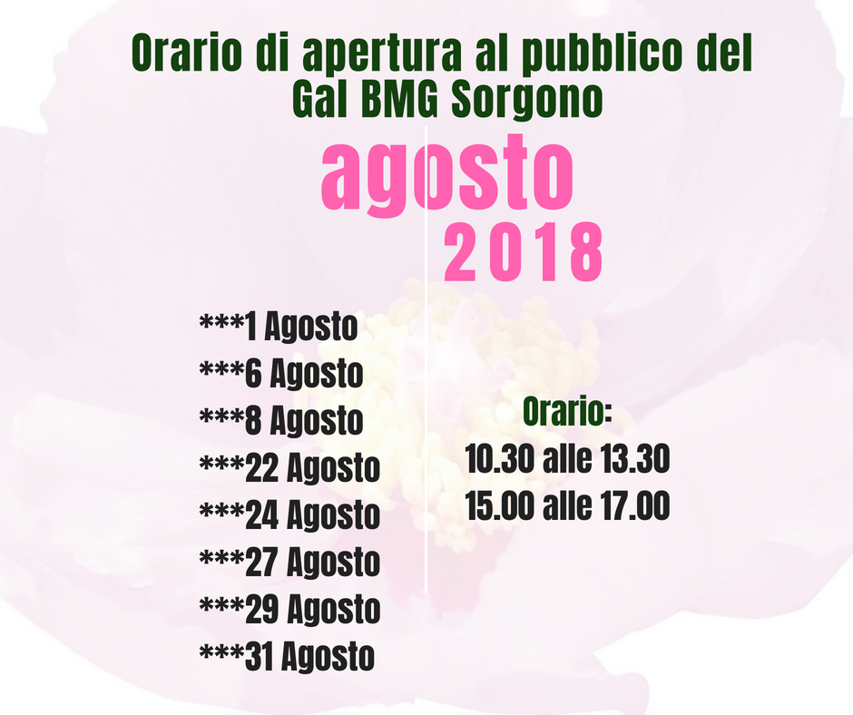 Per tutto il mese di Agosto 2018 gli uffici del GAL saranno aperti al pubblico nei seguenti giorni: