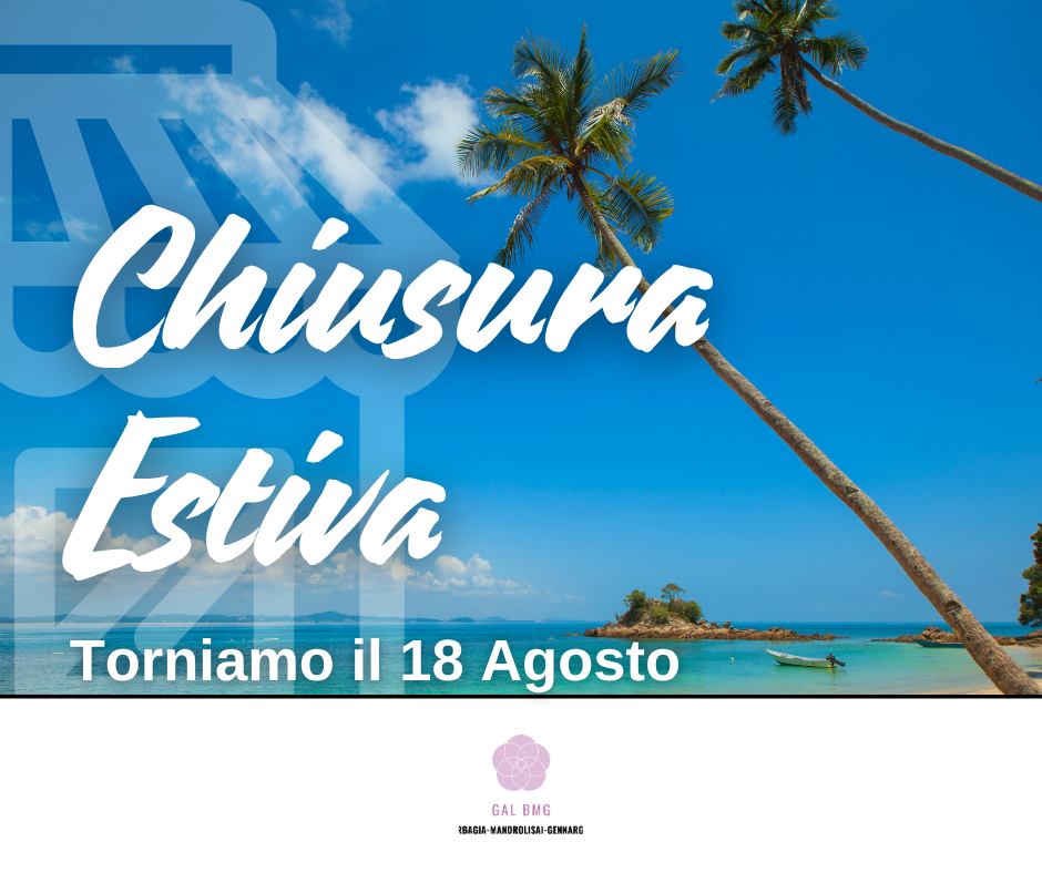 Si avvisano utenti e partner che gli uffici del GAL BMG resteranno chiusi da lunedì 11 a venerdì 15 agosto 2025. La regolare attività riprenderà lunedì 18 agosto 2025.