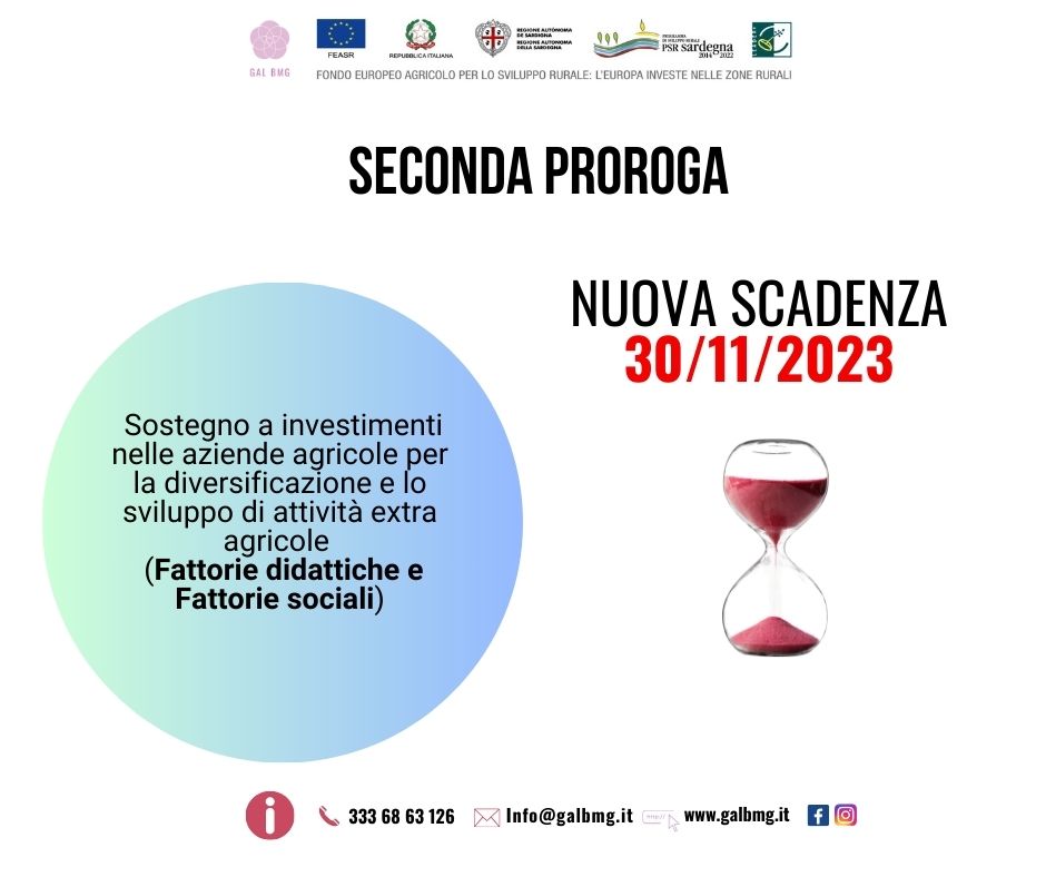 Si rende noto che, con Determinazione del Direttore n. 75 del 27/10/2023, è stato prorogato al 30/11/2023 il termine per la presentazione delle domande di sostegno a valere sul bando con codice univoco 75542 (Azione chiave 19.2.3.1 Inclusione e coesione sociale- Intervento 19.2.6.4.3.1.1 “Sostegno a investimenti nelle aziende agricole per la diversificazione e lo sviluppo di attività extra agricole (Agricoltura sociale)”