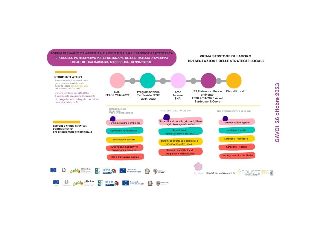 Pubblichiamo il report del primo incontro del percorso partecipativo, Intrecciamo le idee per dare forma al futuro, per la definizione della Strategia di sviluppo locale di tipo partecipativo del GAL BMG-Fondi CSR Sardegna 2023-2027 e PR FSE+ 2021-2027.